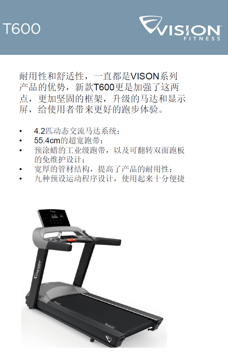 1.耐用性和舒适性,一直是VISON系列产品的优势!新款T600更是加强了这两点,更加坚固的框架,升级的马达和显示屏,给使用者带来更好的跑步体验